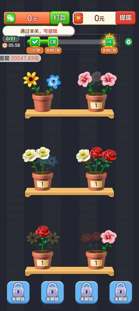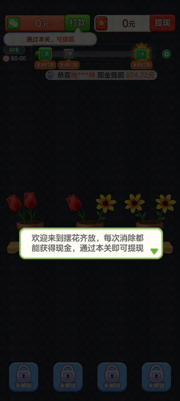 摆花齐放红包版的最新版本,是一款能为玩家带来轻松趣味的益智消除类游戏。在该游戏里,海量福利正等着玩家来领取,让玩家畅享轻松愉悦的游戏体验。不仅如此,游戏中还有各式各样的花朵供玩家领取,极大地增添了游戏的趣味性。并且,这款游戏玩法极其简单,玩家能够轻松上手。要是你对这类游戏感兴趣,可千万别错过。