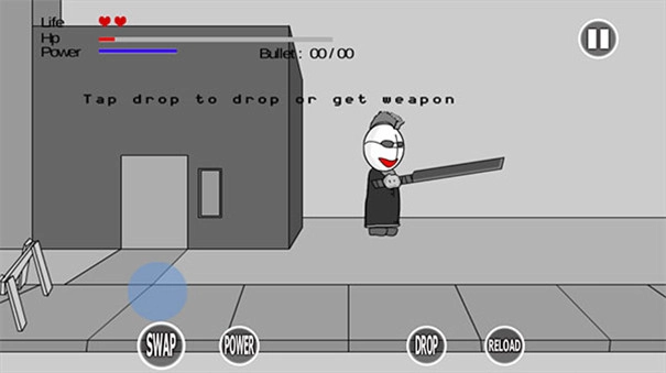 4、进入后,在左侧屏幕移动蓝色圆圈,即可控制角色行走移动。左上角的爱心代表当前生命值,旁边的hp代表经验,power代表力气,这些数值都需要一定时间来恢复。屏幕底部设有快捷按键,例如点击Drop,就能释放机械手中拾取到的武器。