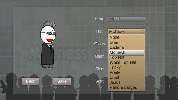 2、在右侧选取head、hat、glass、shirt等外观选项,对发型、眼镜、肤色以及衣服进行自定义设置,完成后点击Save即可保存。