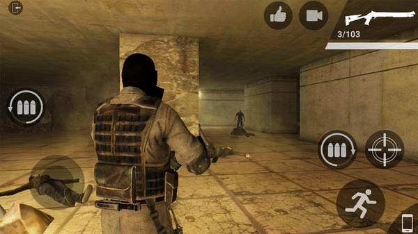 3.左下角圆形虚拟摇杆用于移动与转向,右侧射击与奔跑键配合使用,靠近目标点即可互动,战斗与探索都更顺手。