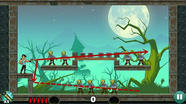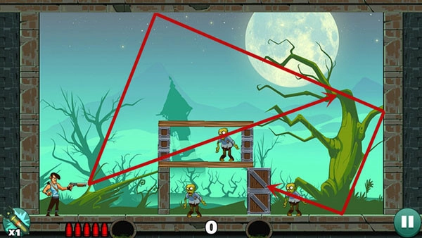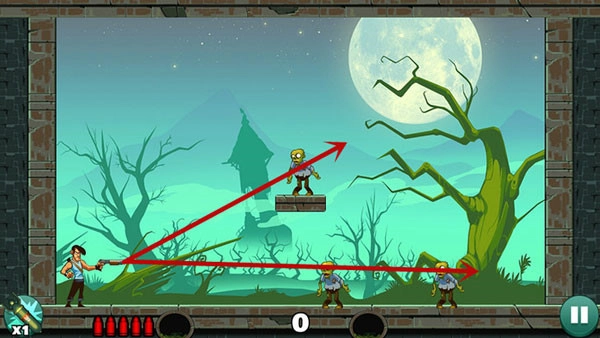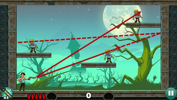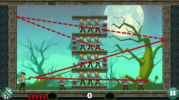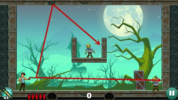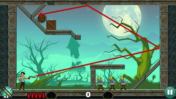 这一关卡相对容易,只需平射一到两次,就能消灭下方的僵尸。上方的僵尸则借助反弹来击杀,要是无法准确找到合适位置,不妨多消耗几发子弹来摸索。