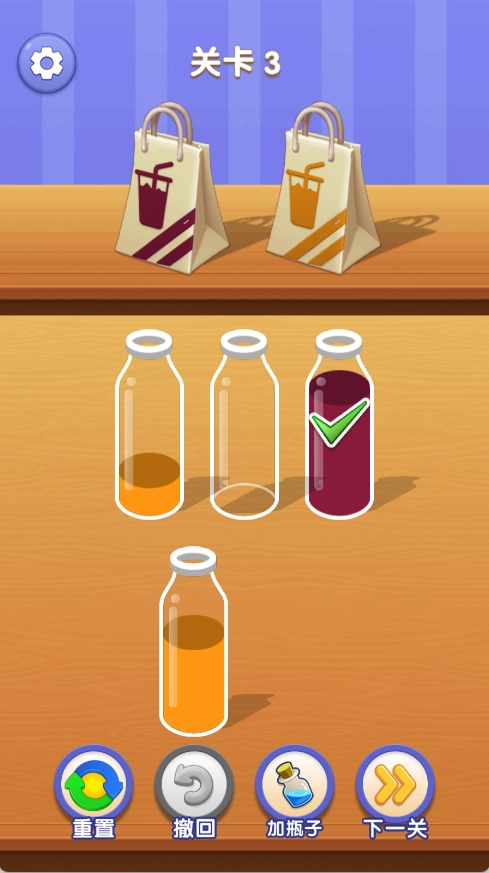 2、操作十分简便,仅通过点击与拖拽就能实现倒水。然而,要想合理规划步骤,避免容器空间的浪费,就需要运用清晰的逻辑思维来完成这一挑战。