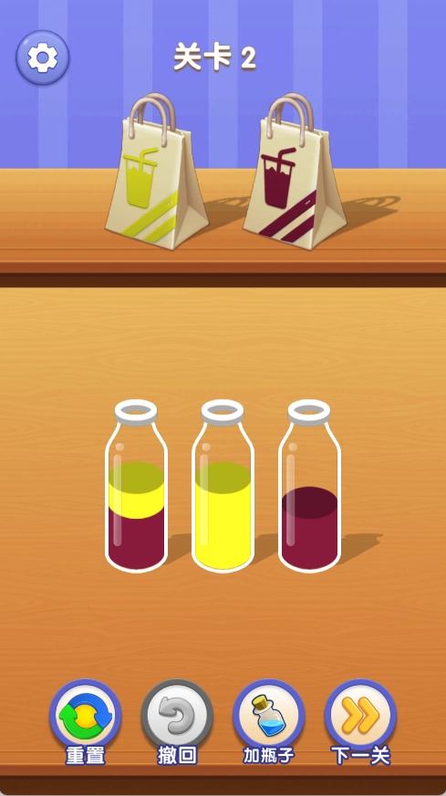 1. 在每一关里,都会面对多个装有不同颜色液体的容器。需借助倒水操作,把相同颜色的液体合并起来,一直到所有容器都装满单一颜色的液体为止。