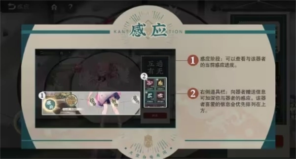 器者的感应共分为十个阶段,分别为感应、倾盖、投契、相惜、鹿鸣、纹枰论道、推心置腹、风雨同舟、莫逆之交以及高山流水。当倾盖、相惜、纹枰论道、风雨同舟这四个阶段达到满级时,器者的常击技能将会分别提升至2级、3级、4级和5级。