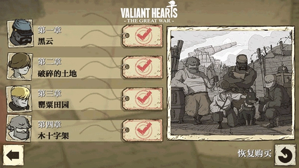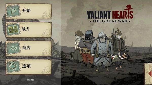 1、游戏以五位主角为核心展开:法国农民埃米尔、德国青年卡尔、美国士兵弗雷迪、比利时护士安娜,还有他们忠诚的狗狗华尔特。