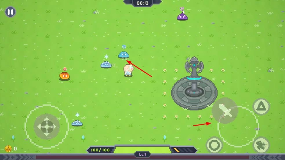 2、进入战斗,操控角色移动攻击史莱姆等怪物,收集场景道具,留意时间与血量,通过技能按钮作战。