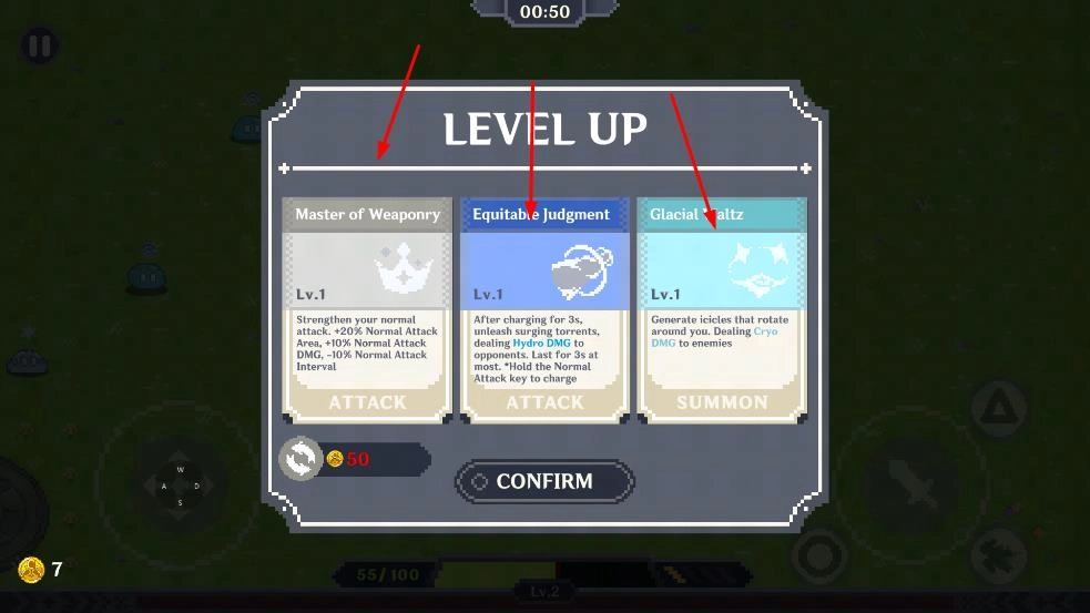 3、升级时从武器大师、公正裁决、冰舞等技能中选择,消耗金币确认,强化能力推进关卡。