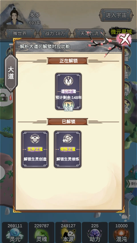 通过探索和任务,收集各种资源,包括先天生灵、先天灵宝等,利用这些资源创建属于自己的修行之物,增强实力和影响力。
