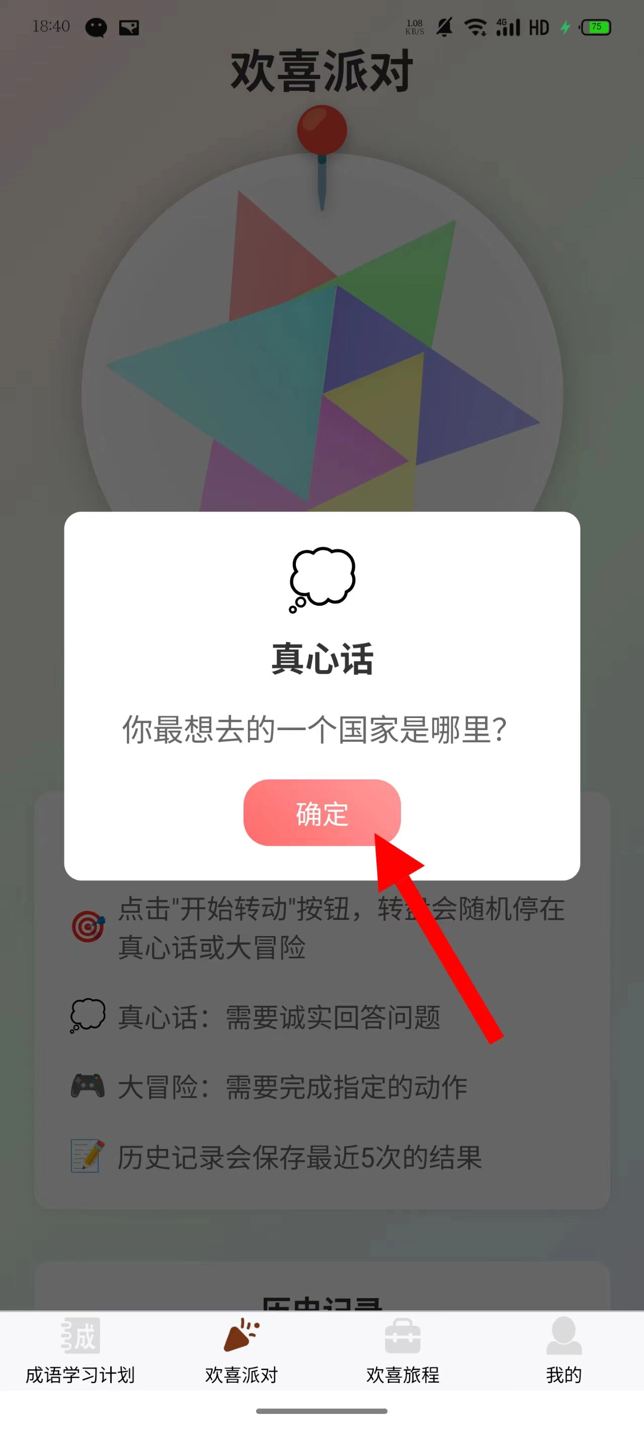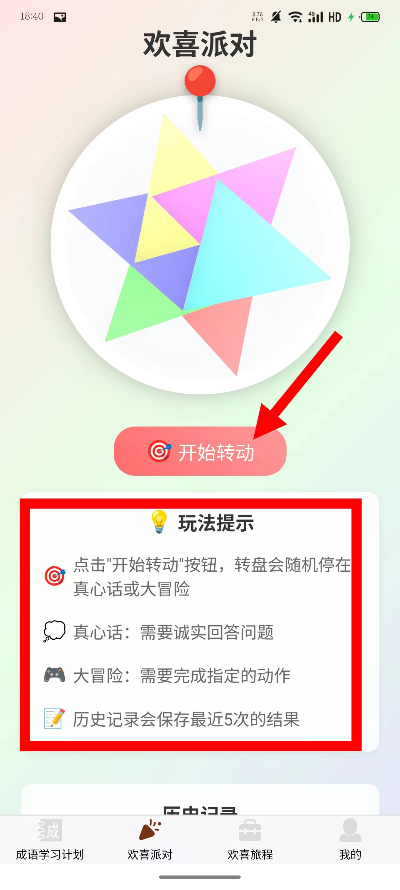 2、进入欢喜派对游戏页面,观看玩法提示,点击开始转动。