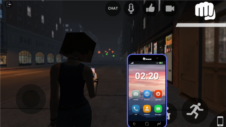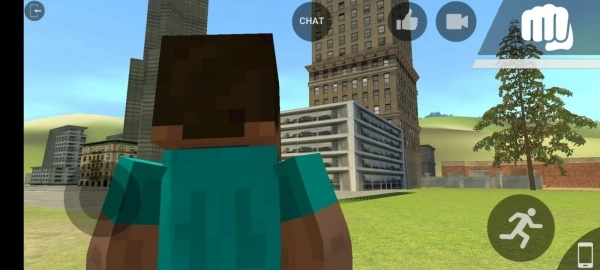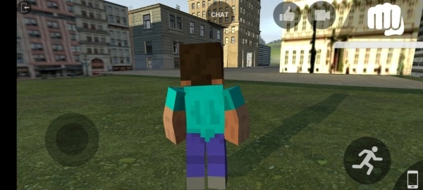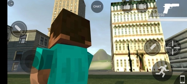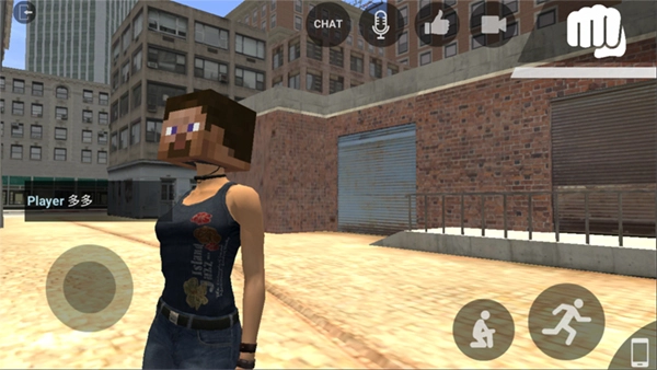 1、进入游戏后,可先点击chat对话。其中,左边的圆圈用于控制前进或后退,右边的圆圈则用于实现蹲下和跳跃操作。