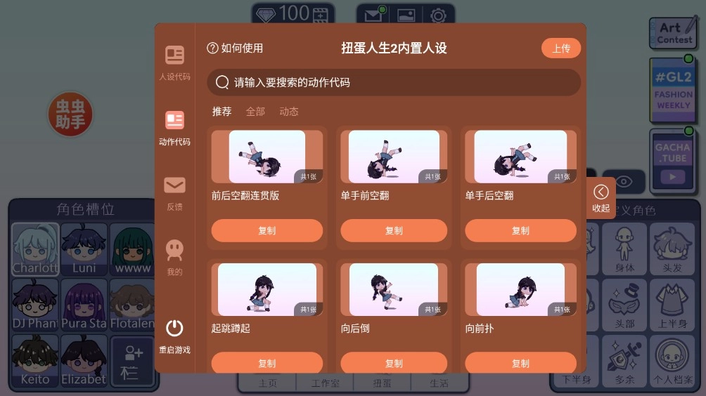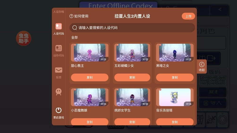 1、点击虫虫助手悬浮窗打开人设代码菜单,找到感兴趣的人设,然后点击【复制】