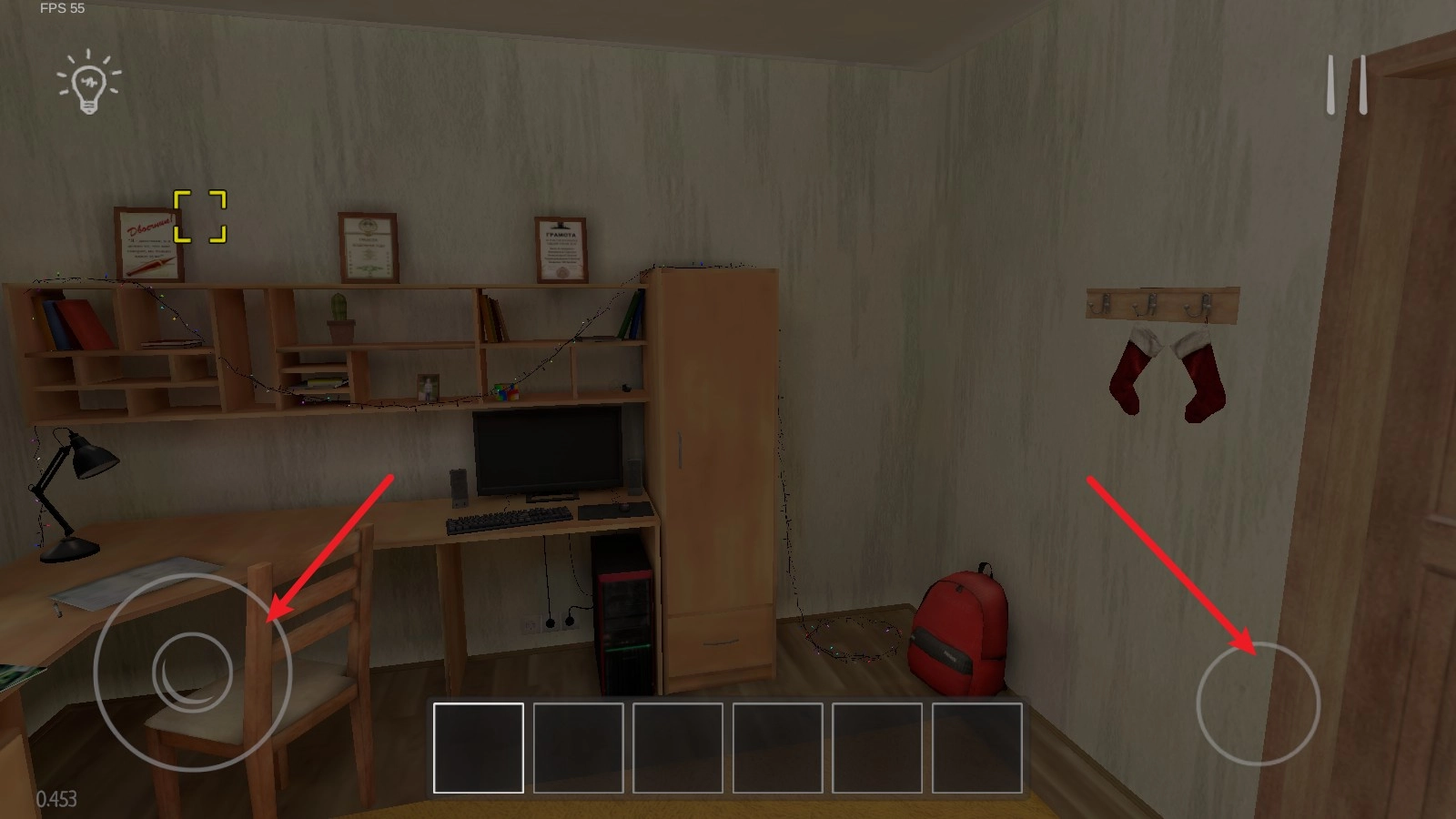 1. 游戏启动后,玩家会处于自己的房间之中,利用左侧摇杆来操控角色移动,而右侧按钮是用来控制角色起立与下蹲动作的。
