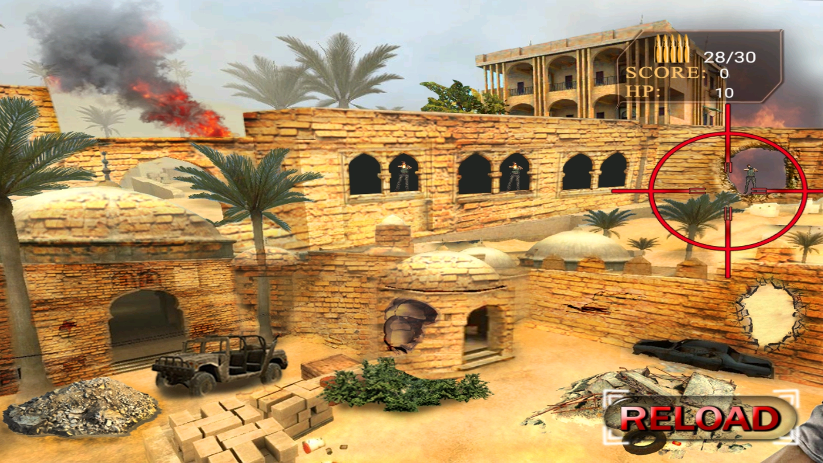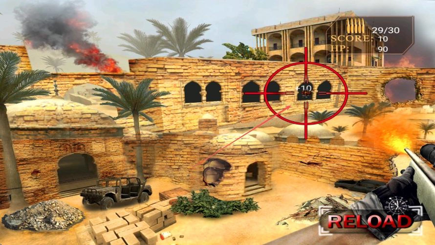 2、发现敌人后,将瞄准镜的准星对准敌人,点击射击按钮开枪攻击,每次成功击中敌人,会增加得分。