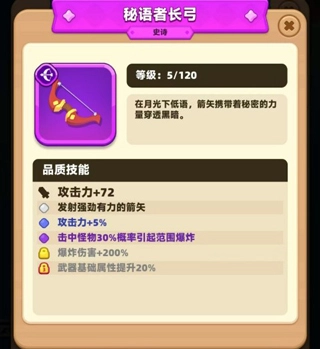 2、秘语者长弓作为史诗级武器,玩家获取方式较为简单,可通过合成手段得到。该武器能增加72点攻击力,射出的箭矢威力强劲,还能提升5%攻击力。击中怪物后,有30%几率引发范围爆炸,爆炸伤害增加200%,武器基础属性提升20%。这些属性加成,能大幅提升玩家实力。