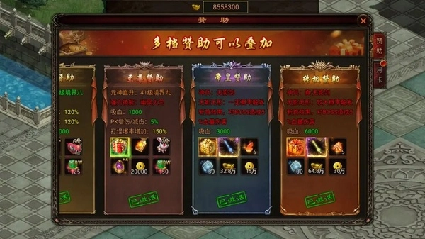 您能够在游戏界面的右上角发现【赞助】这一相关图标。一旦激活赞助,不仅能获取高额属性加成、享受自动回收功能,让您的游戏体验全方位升级,还会拥有专属分线,得以独自挑战高级BOSS。