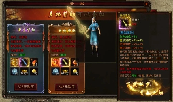 最高的两个阶段分别是帝皇赞助与终极赞助。帝皇赞助配备元神直升奢华礼包、元宝以及强化材料。而终极赞助在此基础上,还能获得超高属性神兵与真无影剑。真无影剑拥有较高几率触发斩首效果,一旦触发,就能对 BOSS 造成其 5%血量的斩杀伤害。