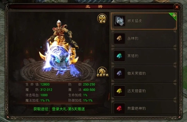 登录大礼第5天赠送撼天猛虎;福利大厅每日礼包可获取丛林豹;丛林豹能合成黑猎豹;黑猎豹合成傲天黑猎豹;傲天黑猎豹合成迅天猎雷豹;迅天猎雷豹合成熬雷绝神豹;熬雷绝神豹合成邪影银月狼;邪影银月狼合成赤影银月狼;赤影银月狼合成血影银月狼。