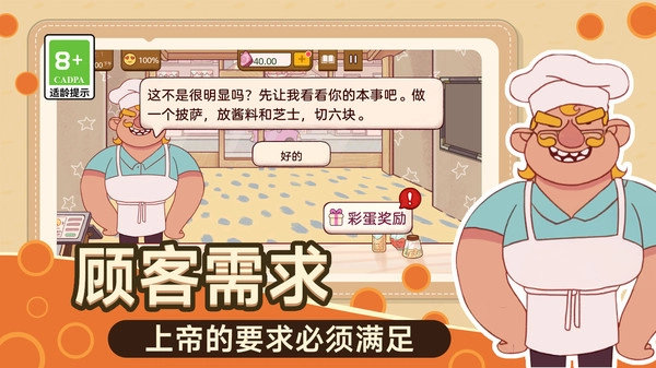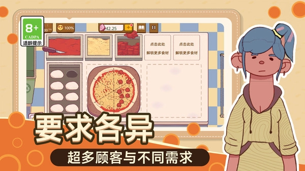 《疯狂的大厨》是一款趣味十足的经营模拟类游戏。在游戏里,玩家将化身为一家披萨店的老板,以别具一格的方式来打理自己的店铺。你能够挑选钟爱的装修风格,营造出一个整洁又惬意的就餐环境。同时,制作各式各样口味的披萨,去满足顾客们不同的口味需求。精确把控烹饪过程中的每一个环节,确保披萨拥有绝佳口感,从而赢得顾客的高度好评与积极推荐。