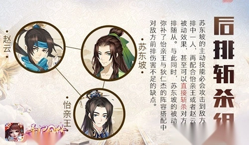 苏东坡发动主动技能时,必定会对敌方后排中的一人发起攻击。若搭配怡亲王或赵云的被动效果,甚至有可能直接将对方后排随从斩杀。不仅如此,在怡亲王与狄仁杰组成的阵容里,苏东坡的被动还能弥补该阵容对敌方前排伤害欠缺的弊端。