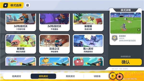 香肠派对支持2v2枪战模式,支持躲猫猫模式、近战之王模式、狼人派对模式