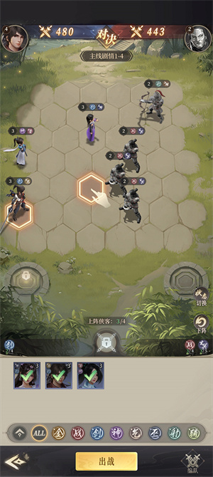 2、在对战中玩家需要挑战好自己侠客的站位,要合理利用好防御属性的角色和攻击属性的角色;