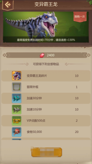 首充变异霸王龙礼包:内含的变异霸王龙是具有内政加成效果的龙宠,其军团技能与城市建设紧密相连。在游戏前期,它能帮您节省大量时间,加快发展进程,实际体验后您就会明白它的优势。有变异霸王龙助力,面对入侵者时,您能迅速通关抵御。