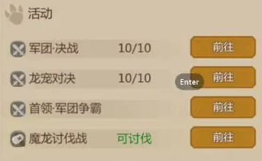 军团决战:依据龙宠规模,借助系统兵力展开战斗,排名奖励十分丰厚,尽早提升排名为佳。后续可与盟友商议出兵策略,争取打到第一名以兑换皮肤奖励,日常只需挑选能够战胜的玩家作战即可,从高排名攻打低排名,即便获胜,排名也不会改变。