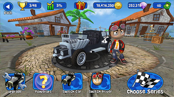 2、底部菜单中,第一个选项为修理,它能对赛车性能进行升级优化;第二个选项是无敌状态,开启后赛车不会受到伤害;第三个选项是选择车型,在这里可以挑选心仪的赛车型号;第四个选项是人物选择,不同的人物角色拥有不同的特技,可在赛场上发挥作用。之后,点击“Choose Series”来选择关卡。