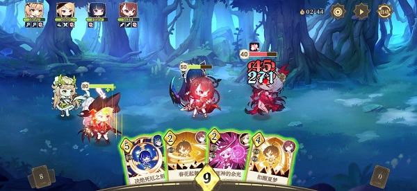 每场战斗中,指挥可以上阵4名乐姬,每个乐姬拥有3张独特技能卡牌,也就是总数12张。开始战斗时会先抓取其中4张,其余牌进入“牌库”。当打出的手牌进入弃牌堆后,系统会自动从牌库中抓取新的一张。