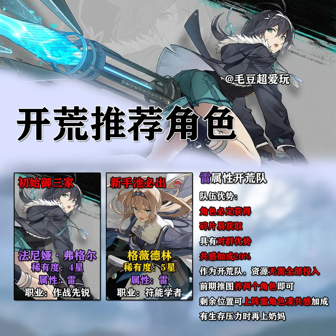 法尼娅和格薇德林,属于御三家且新手池必定能抽到,是每位玩家都能获取的角色。雷系在面对群体敌人时具备优势,战士与法师的搭配进一步确保了队伍的整体输出能力。剩余两个队伍位置,可选择相同属性的角色,以此增加元素共感(无需进行养成)。当队伍出现生存方面的问题时,再安排奶妈上场就可以了。
