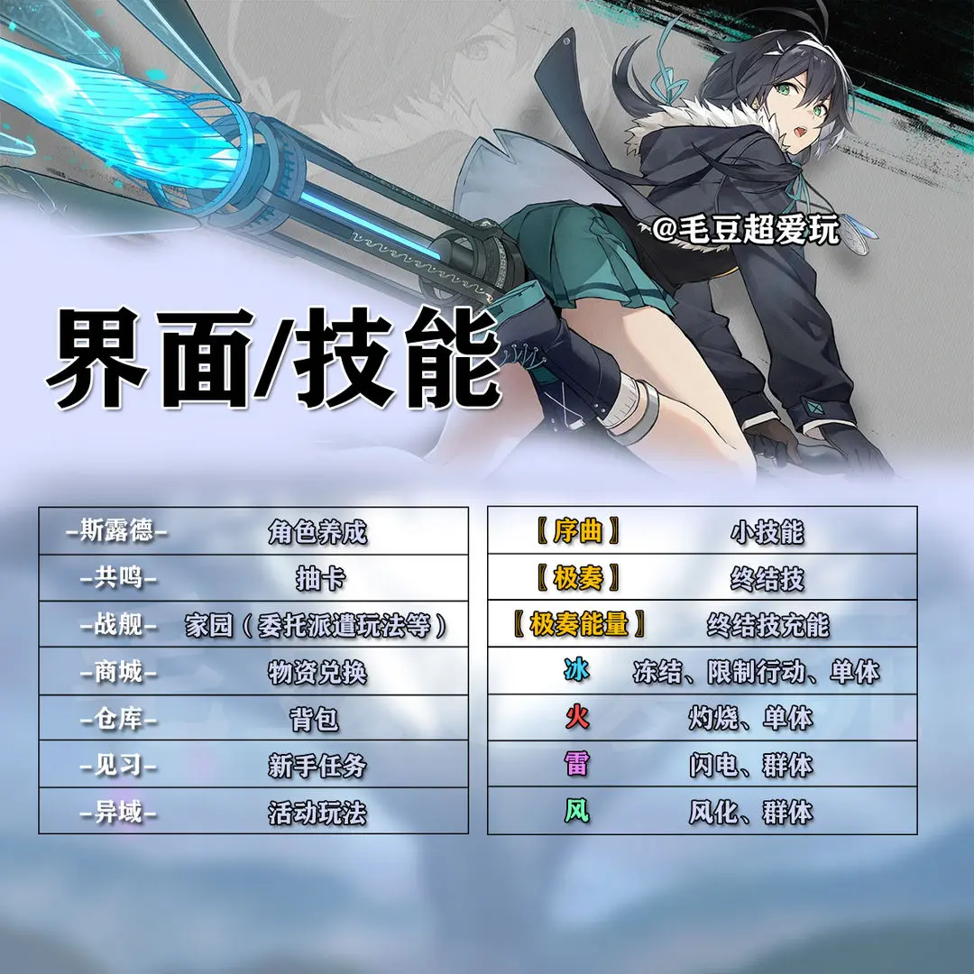 图中整理了主界面显示的部分功能,更细更具体的角色搭配、元素玩法等请看开荒指南之角色推荐篇。