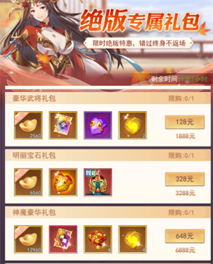 除此之外,游戏中不定期的“限时特惠”、“周限购”、“月限购”中也有很多超值礼包。主公可以根据自己的需求购买~