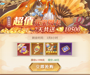 元宝周卡仅仅只需68元,就能每天领取1500元宝,持续七天。
