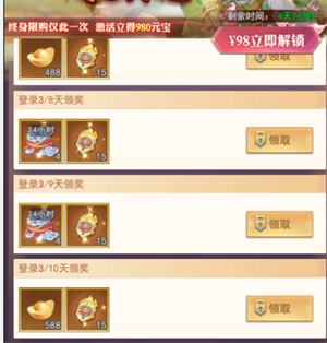 限时活动中的“绝版限购”,只有开服前期才会有,而且终身只能购买一次。