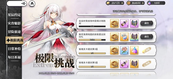 极限挑战:地图探索度、实时竞技次数、爬塔层数。