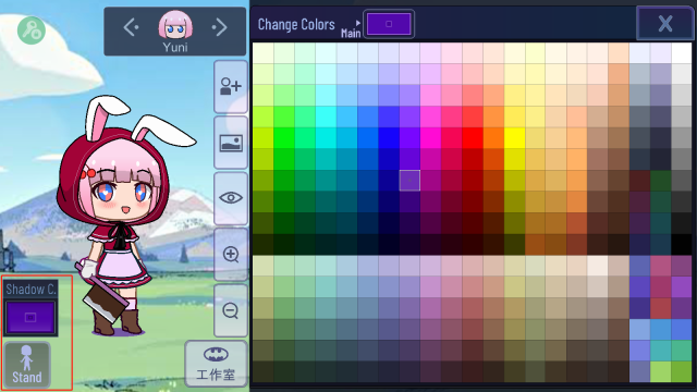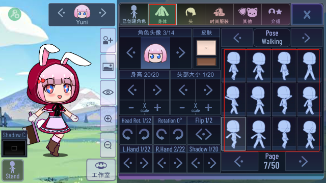 5、轻点shadow,即可对阴影颜色进行修改;点击stand,能让角色呈站立状态,再次点击则会恢复到先前设定的身体动作。