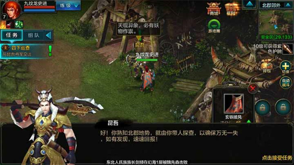 选定职业进入游戏后,1级主角诞生于北郡,北郡即新手村,此时开启第一章剧情任务“三月无雨旱风起,重回华夏战女魃”。在北郡,玩家可接取1 - 6级主线任务,这些任务主要是介绍游戏世界观与进行新手操作引导。从首个任务“北郡惊梦”起始,直至“意外遭遇”,北郡的主线任务结束。玩家只需依照任务指引行动,完成任务便能迅速提升等级至6级,6级后便可进入下一个区域。