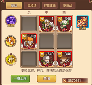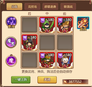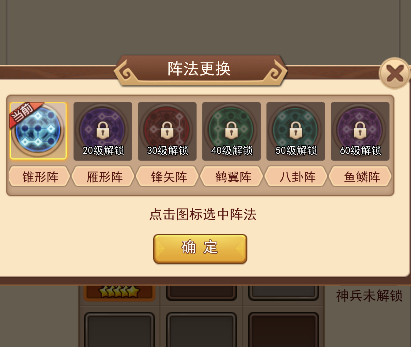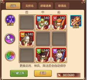 2、阵法:达到一定等级后开启更多阵法阵形,更换阵法来调整出手顺序和受击顺序,战斗中可能会有意想不到的效果。