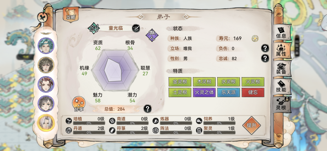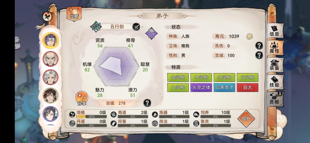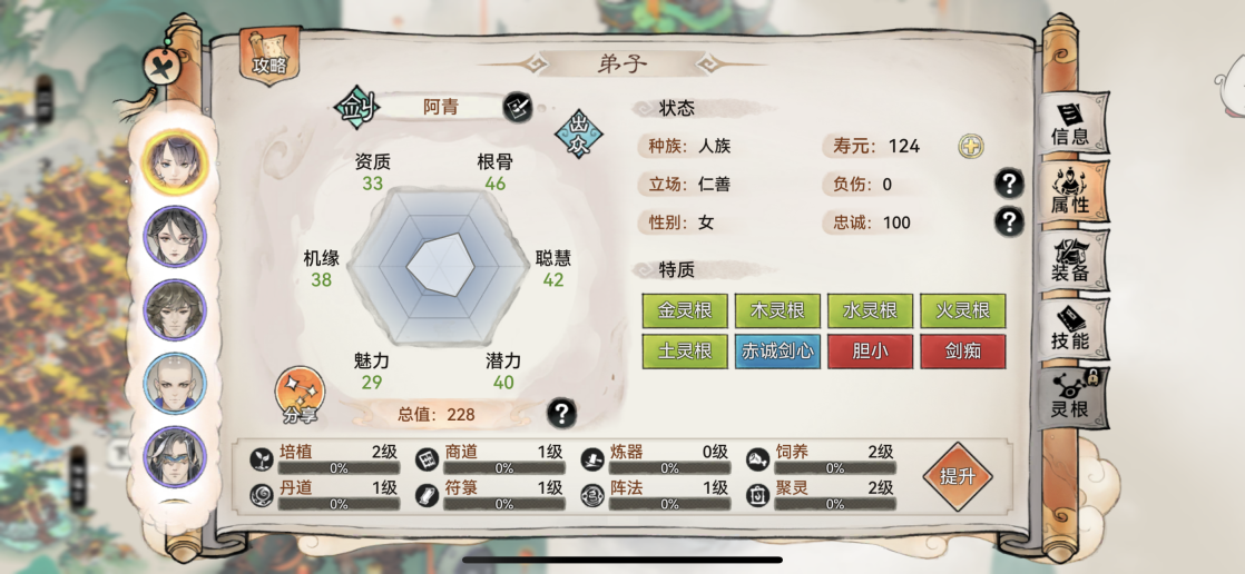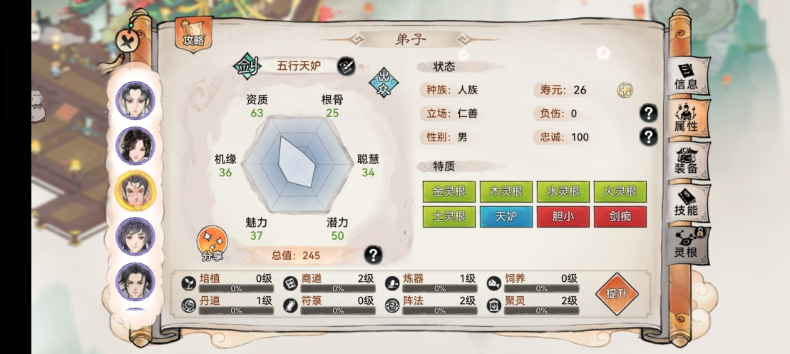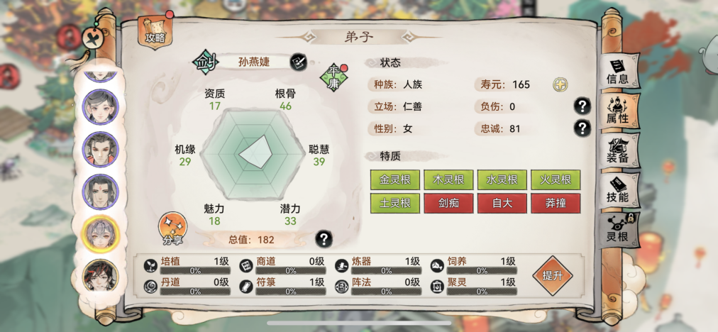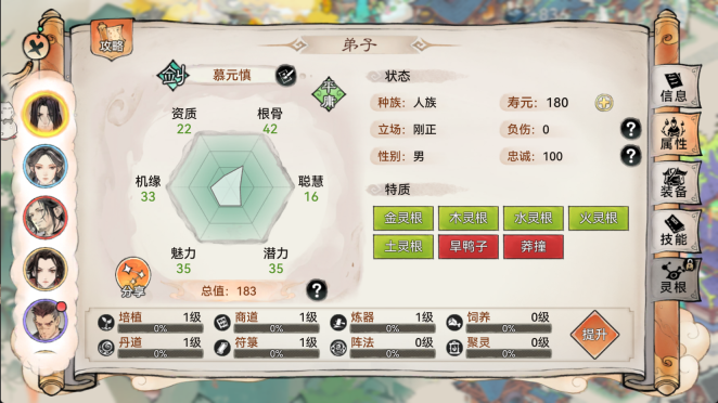 第五梯队的弟子,需满足五行灵根且六维合格,参考图八与图九。这类弟子基本能达到潜力值满、根骨较高的状态,不过大多没有特殊词条,即便有,也仅有一两个用处不大的词条。若没有更好选择,可将其作为过渡。无需投入过多精力培养,后续进行传功即可。