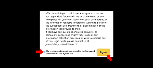 1、在七匣子下载并安装JUMP Assemble后,进入下方界面,把上方的条约直接拉到底部,接着勾选左下方的条例,再点击Agree按钮。