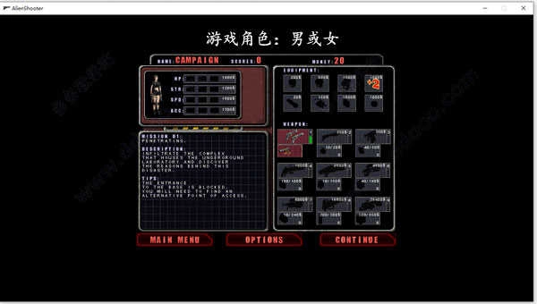孤单枪手仅提供男、女两个角色供玩家选择,二者基础数据略有差异。男性角色在防御力和生命值方面更具优势,而女性角色则侧重于攻击力和移动速度。考虑到部分玩家的需求,游戏支持设置画面中血的颜色,可在绿色与红色之间选择。玩家在游戏中最多能够同时使用9种武器,除了初始武器双持手枪外,其他武器均存在弹药限制。弹药和武器需在每一关开始前的商店界面进行购买,且游戏内仅有三种护甲。