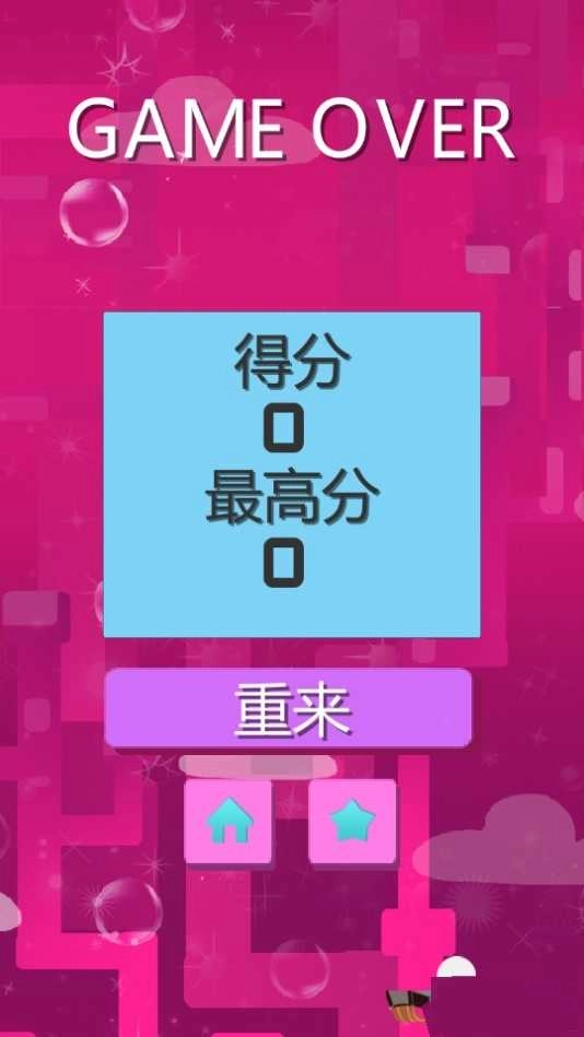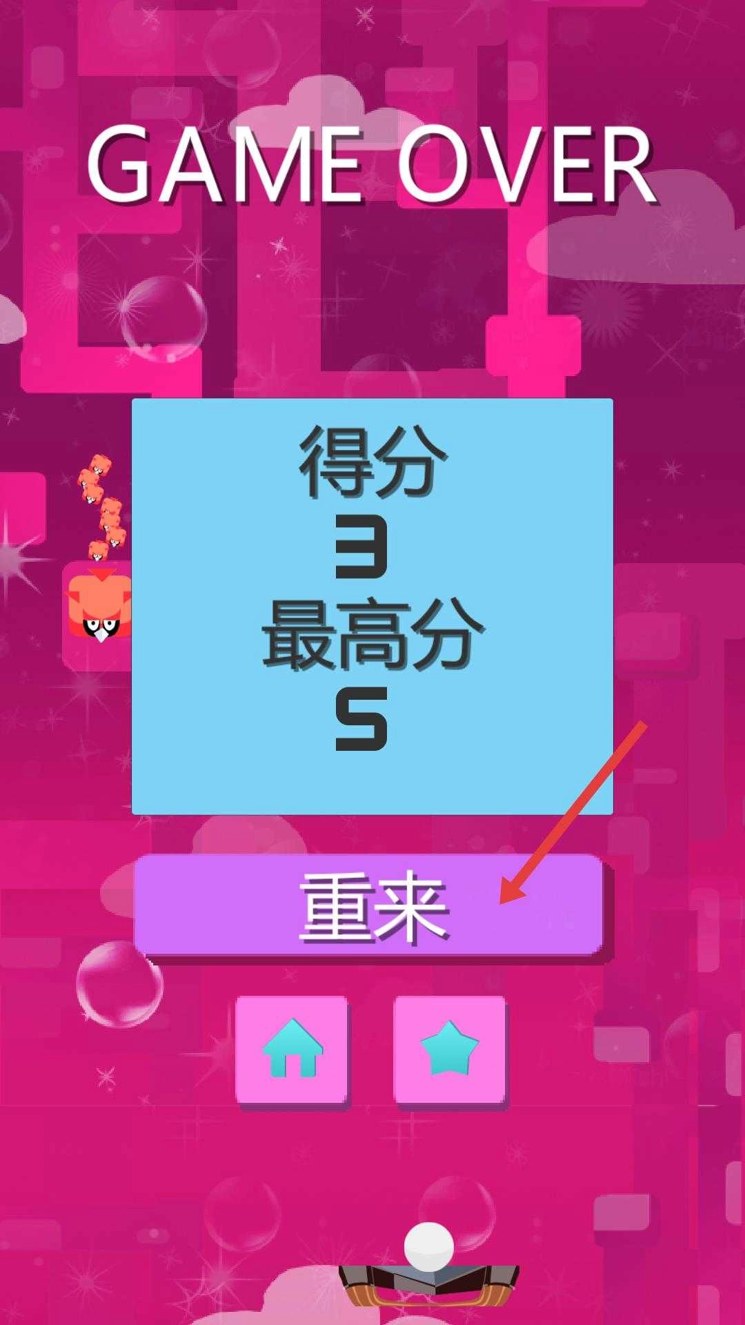 4、当游戏结束时,界面会展示得分以及最高分,在此情况下,点击紫色的“重来”按钮,就能重新开启游戏,再次进行挑战。