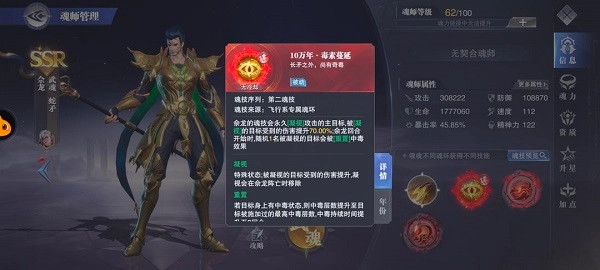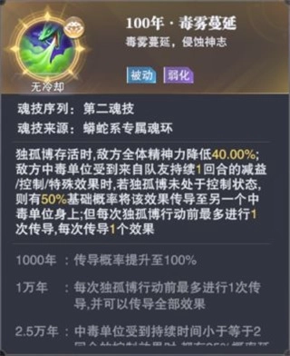 最后,咱们讲讲各类减益buff。在对决中要是碰到控制流打法该如何应对呢?首先要清楚,游戏里的控制技能是由精神力这一属性决定的,精神力数值越高,控制的概率也就越高,再结合魂技自身的概率,就是最终实际的控制概率。了解了这个机制,我们就有应对办法了。首先,可以通过降低对方精神力来减少其控制概率。这里以毒斗罗独孤博为例:独孤博的第二魂技——毒雾蔓延。