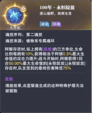 此类魂师需与各类辅助进行搭配,像增强生存能力的防御系魂师、负责打火的辅助系魂师,以及提供伤害加成的buff魂师等。而要克制这类魂师,有三种途径:其一为增益,在游戏里,我们能见到形形色色降低伤害的buff,比如阿银的第二魂技——永恒绽放(详见下图) 。