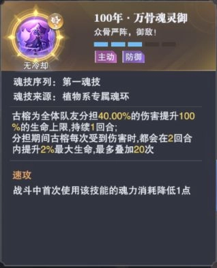 若我们在游戏里想要应对这类魂师,就需要借助一些保护机制。除了与AOE输出相同的三种克制办法外,还能用分担伤害的魂技来应对。在游戏的分担伤害机制中,骨斗罗古榕必然是首推。在对决开始前释放其技能,能保护全体队友分摊伤害,让敏攻系魂师的单体输出转移到自身,从而达成保护阵容完整性的目标。下面,我们先来看看相关技能。