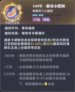 要是遭遇各类减益buff该如何是好呢?像破甲、重伤、毒以及灼烧这类buff,能让特定魂师打出高额输出(比如剑尘心就极为依赖破甲buff)。一旦承受住这类伤害,阵容很可能就不完整了,而且极有可能因为核心魂师阵亡而输掉一场对决。面对减益buff,我们可以使用奥斯卡的解毒小腊肠,也就是他的第四魂技。