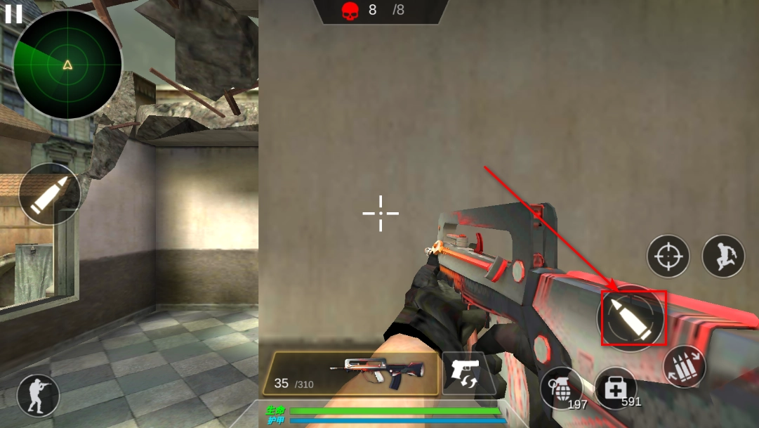 3. 只需点击箭头所指向的图标,就能实现开枪操作。