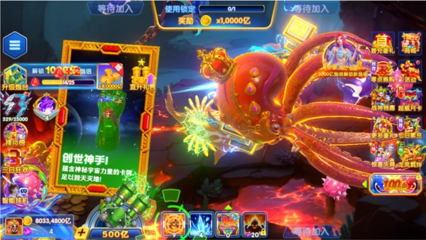 2、各种华丽炫酷的技能,捕鱼会收集一定的能量值,能量值满后可以使用一次终极技能全屏攻击。