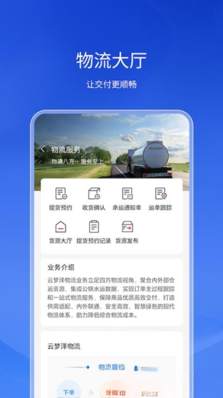 3. 物流服务:设有专属物流大厅,助力用户对仓储及运输过程进行实时管理,达成物流资源的高效调配。