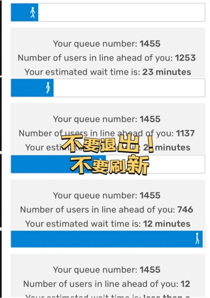 2、到了抢票时间就会出现你排队号数,我是1455-接着就一直等,直到小人走到终点;